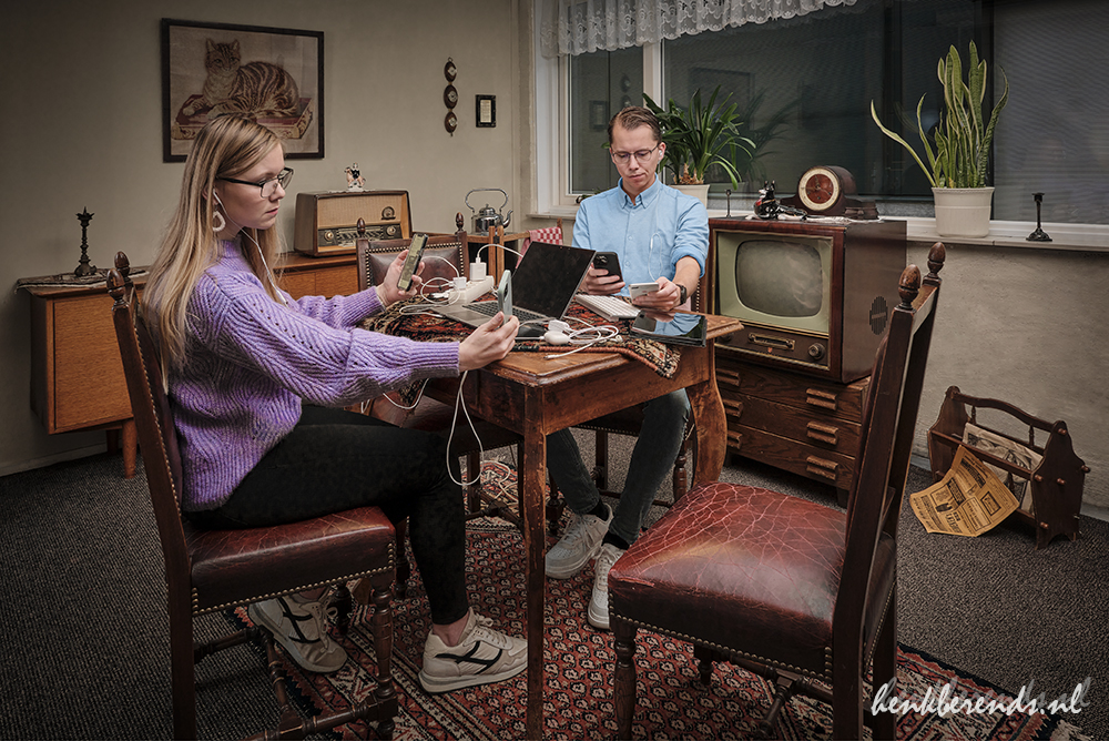 Een conceptuele foto waarin moderne communicatie vergeleken wordt met “grootmoeders tijd”,