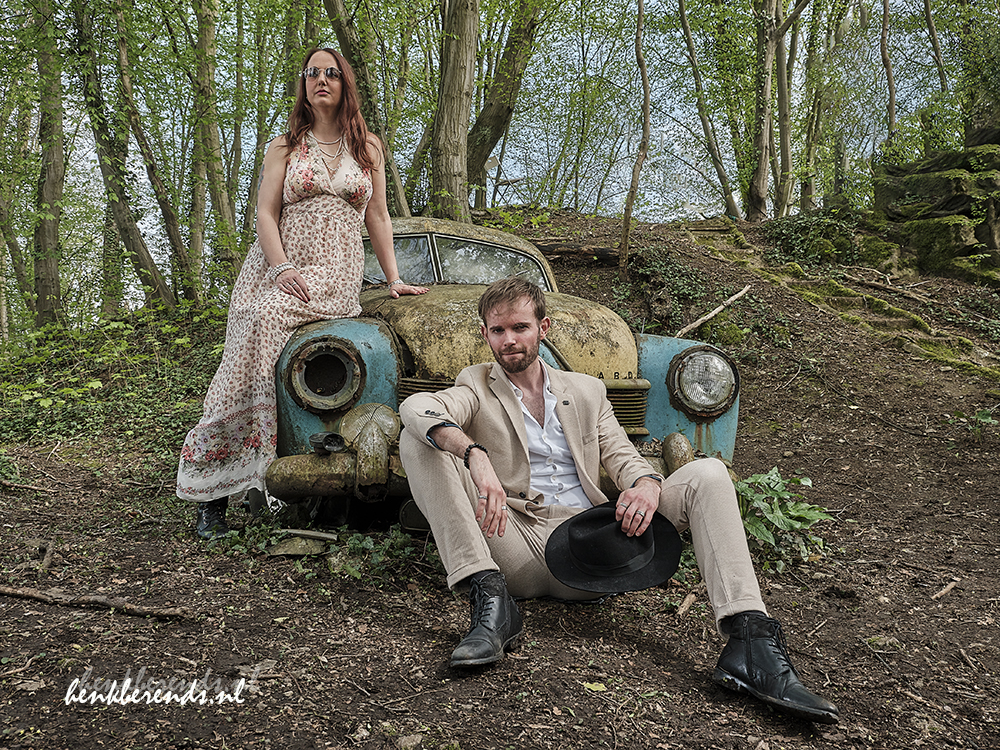 Een bijzondere fotoshoot met Tonya en Niels bij oude, roestige oldtimers in een groot privé park.