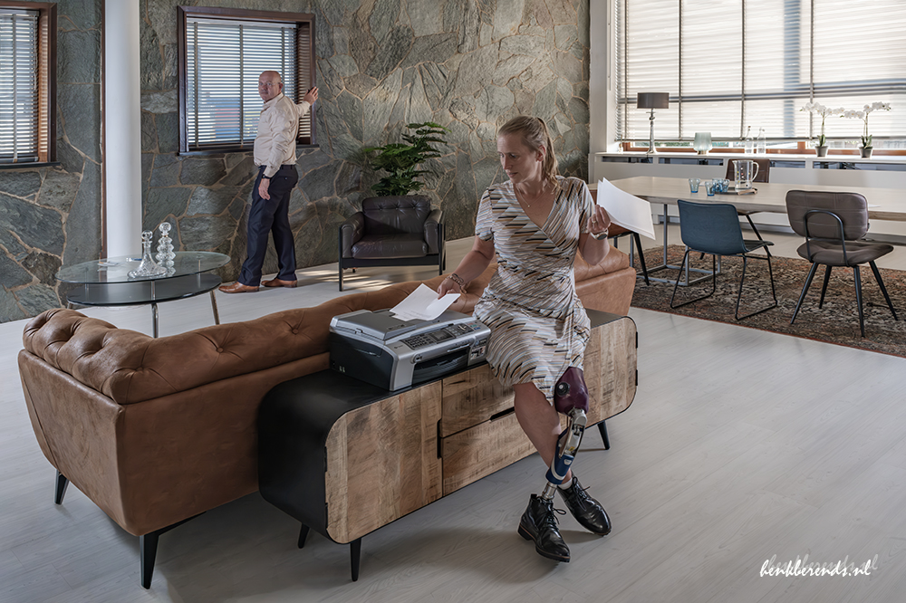 In deze fotoshoot heb ik samen met model Kim en Michel getracht uit te beelden dat een beenprothese geen belemmering vormt voor haar functioneren op kantoor, haar motivatie en wilskracht zijn extra sterk,
