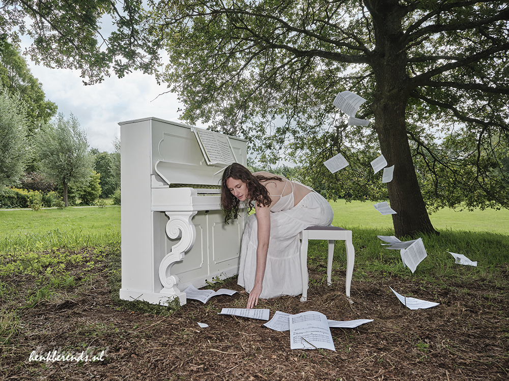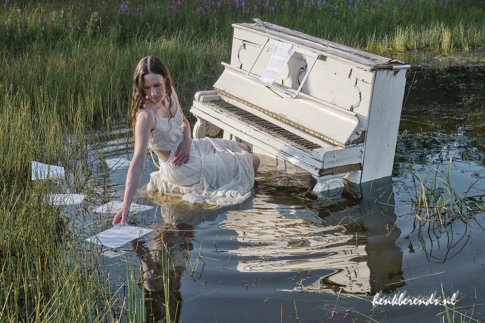 Model Isabel en piano nu in een meertje voor de fotoshoot “Water” in de reeks van “Piano-partituren”