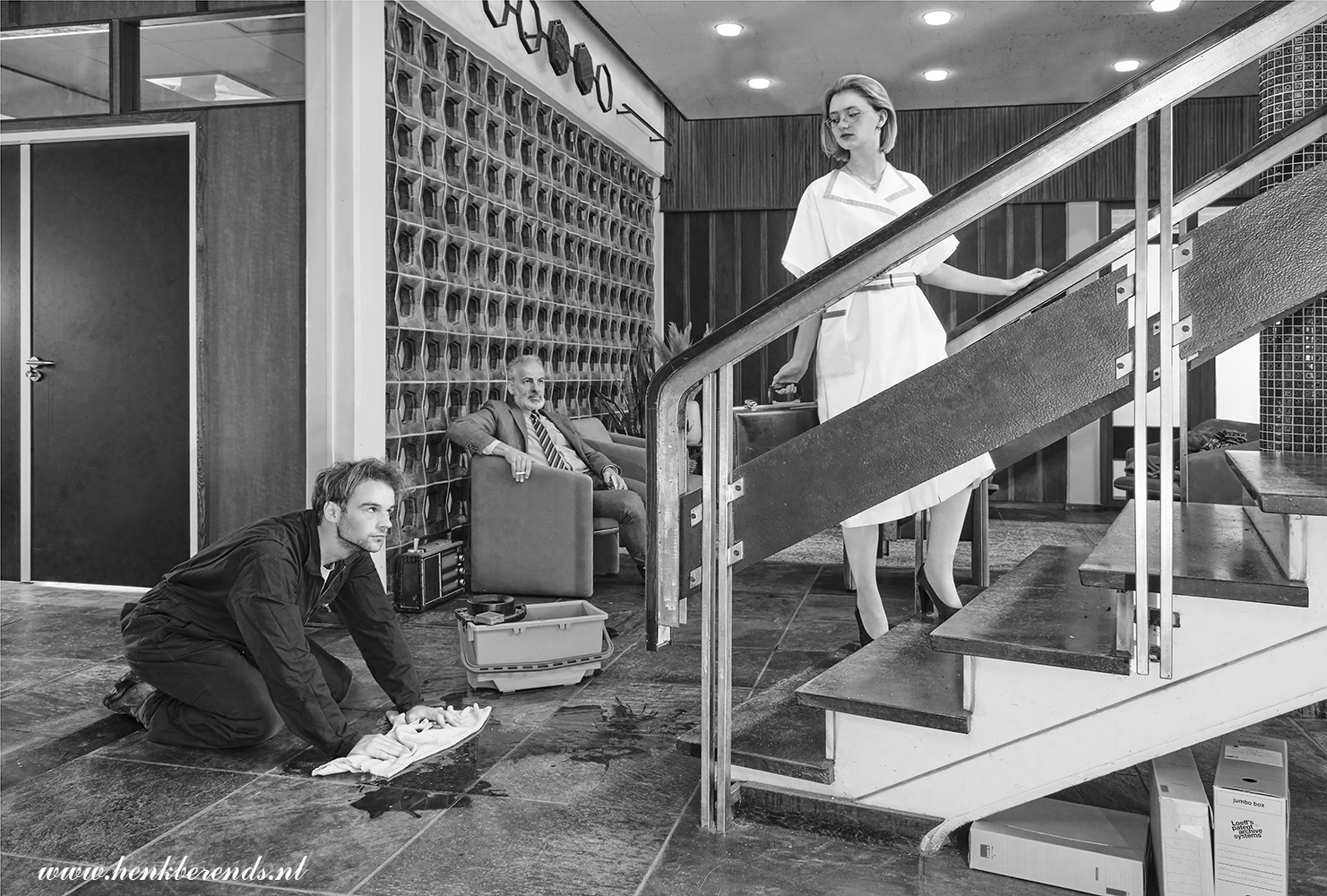 In een jaren ’60 kantoorpand heb ik met drie modellen een rollenspel gefotografeerd op diverse plaatsen, het was hard werken. Naar mijn mening komen de beelden het beste uit in zwart wit,